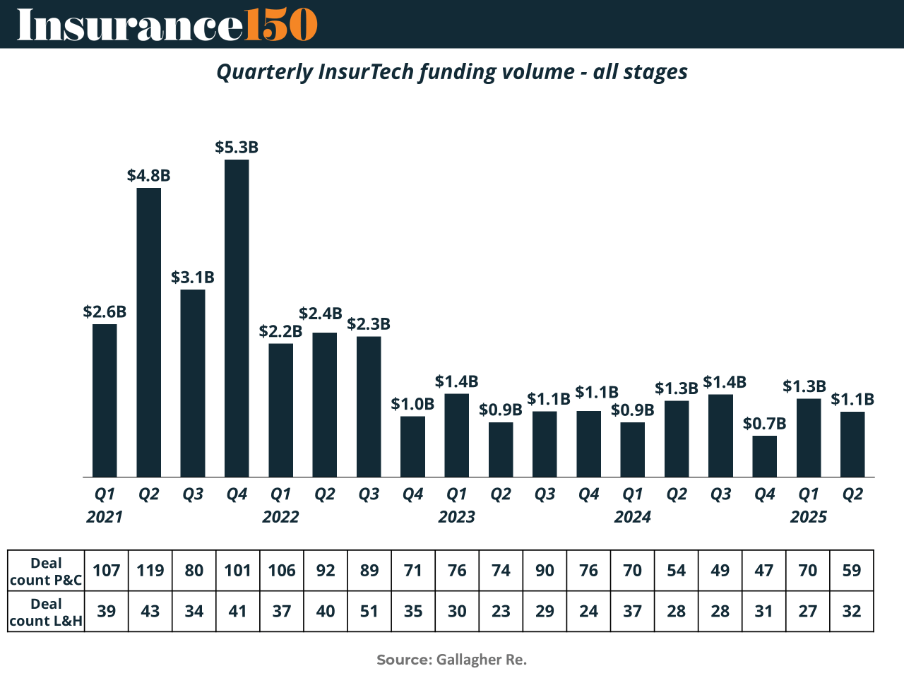 P&C funding collapsed 68% QoQ to $362M, as investors turned cold on traditional underwriting and distribution models. Meanwhile, L&H InsurTechs nearly tripled funding to $728M, with Gravie, Bestow, and Empathy leading a rebound that pushed average deal size to $26M.