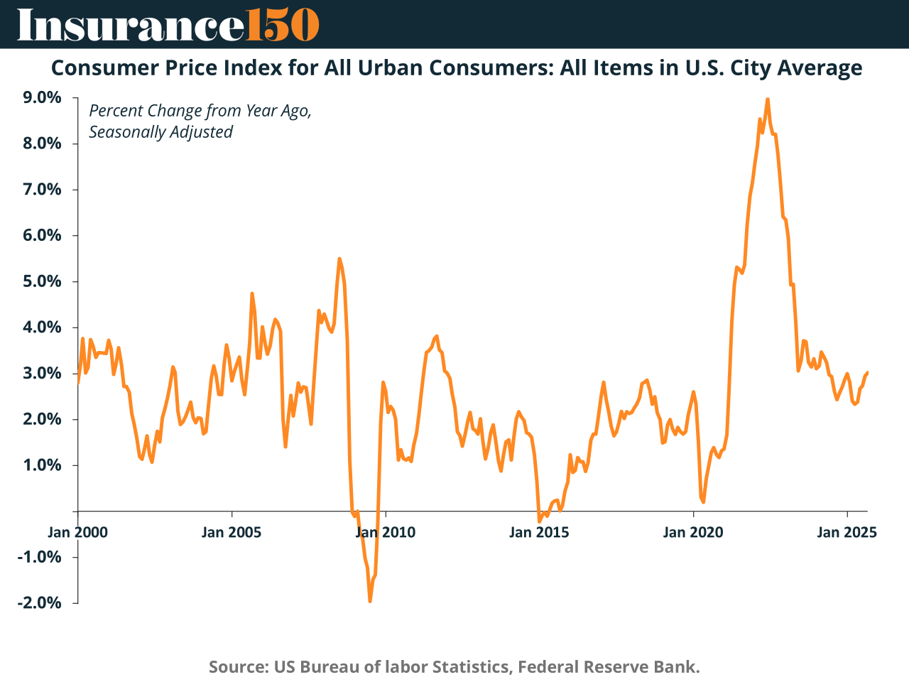 The CPI for all urban consumers shows a cooling trend from the peaks of 2022, but inflation is still more than double pre-pandemic norms, fluctuating around the 3% to 3.5% range. While headline inflation has moderated, price levels remain historically high, especially in essential categories like food, where grocery prices are still 18% higher than in early 2022.