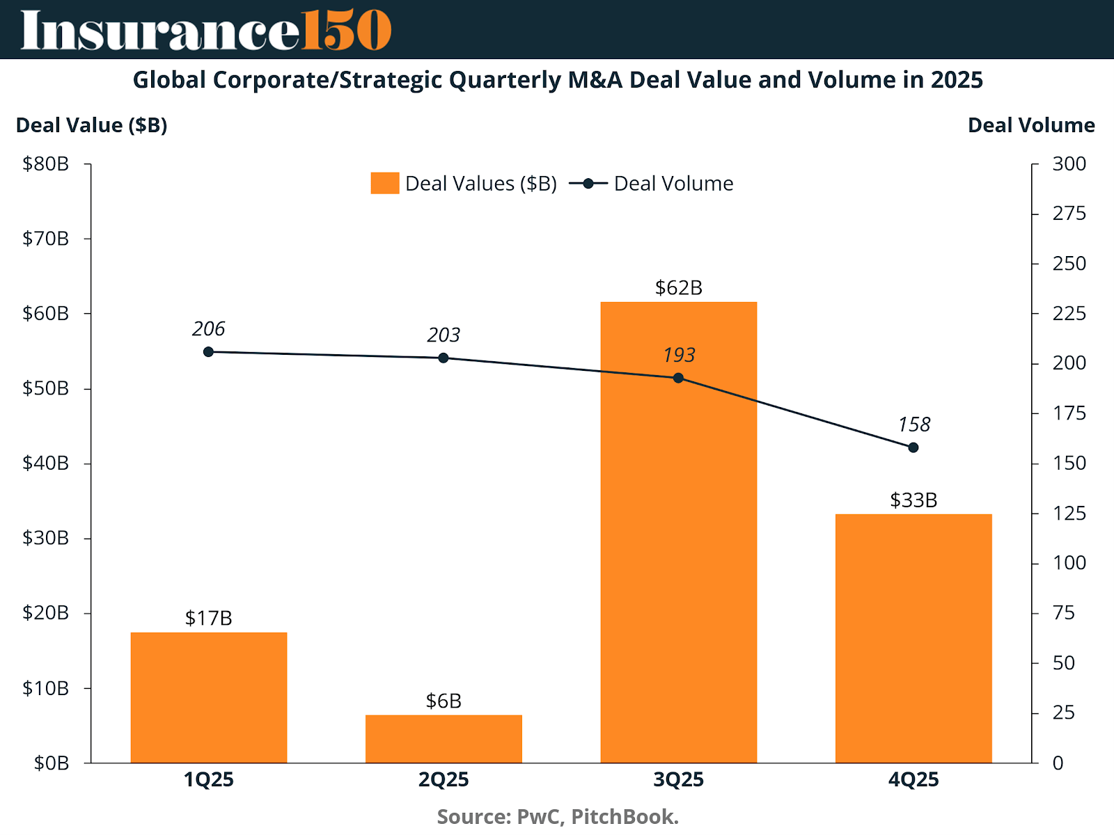 This concentration is further validated by the fact that over 90% of announced insurance deal value in the second half of 2025 was driven by megadeals, even though these transactions represented only a small fraction of total deal volume.
