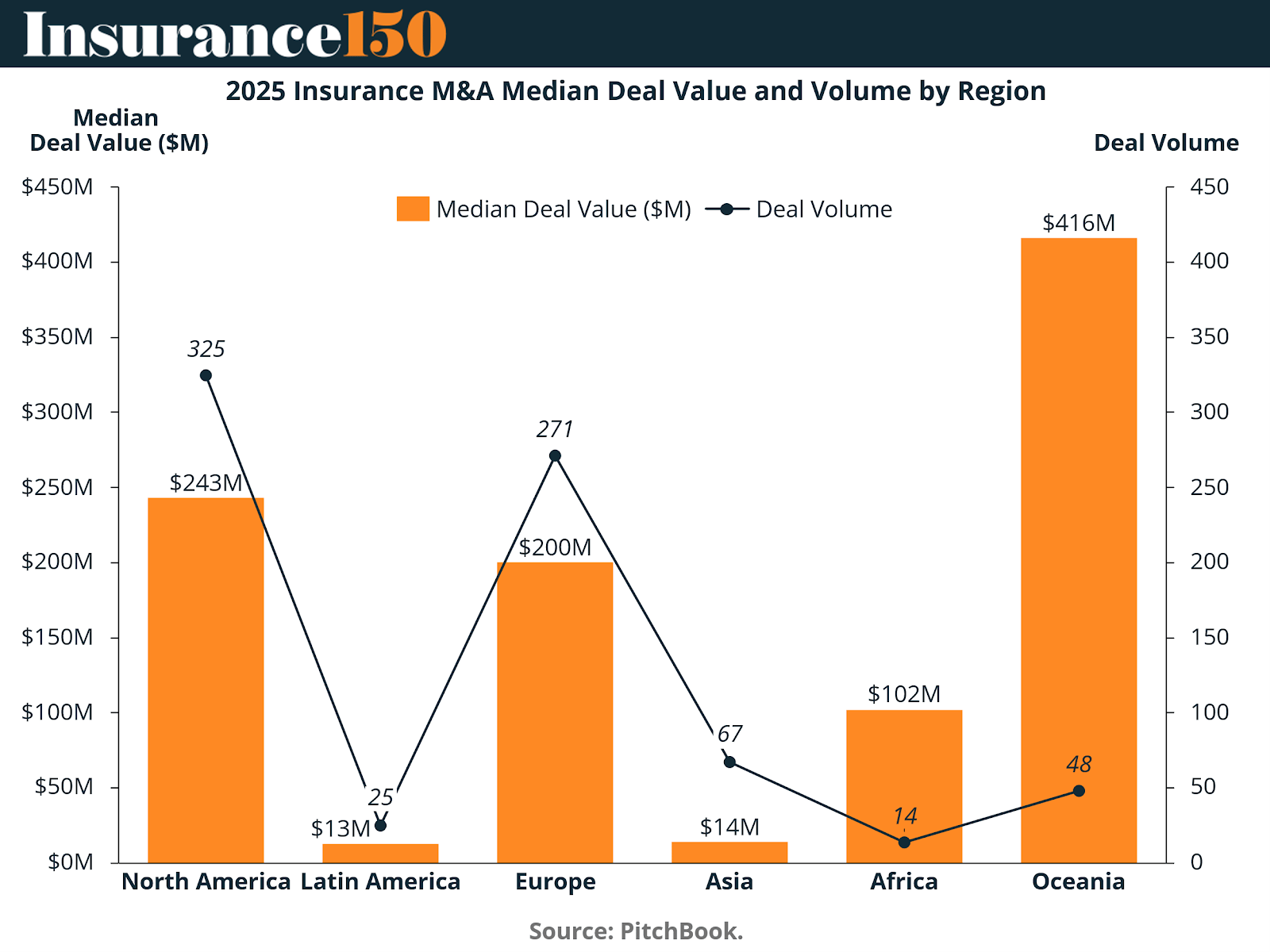 Regional data highlights stark differences in deal economics and strategic intent. North America remains the most active insurance M&A market by volume, with approximately 325 transactions and a median deal value of $243 million, reflecting deep sponsor participation, robust broker consolidation, and strong appetite for specialty platforms.