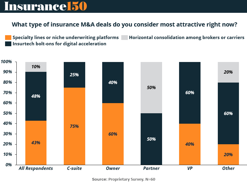 Among executives, the message is loud and clear: 75% of C-suite respondents prefer deals in specialty or niche underwriting. That’s a full 32 percentage points above the average across all respondents.