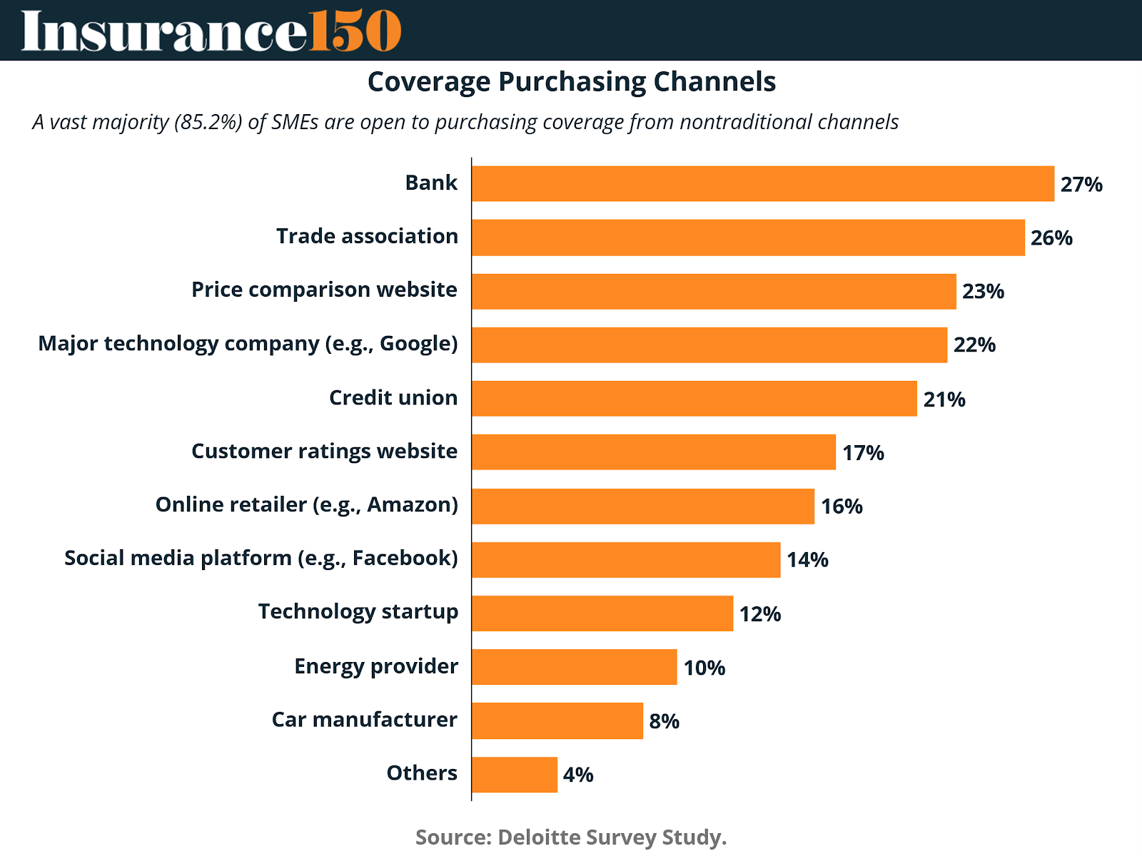 The SME insurance purchasing ecosystem is undergoing a rapid diversification, with small business owners increasingly open to nontraditional distribution channels. Nearly 85% of SMEs indicate willingness to purchase insurance through alternative avenues such as banks, trade associations, or major technology companies. This marks a fundamental shift away from the exclusive dominance of brokers and agents toward a multi-channel, ecosystem-driven marketplace.