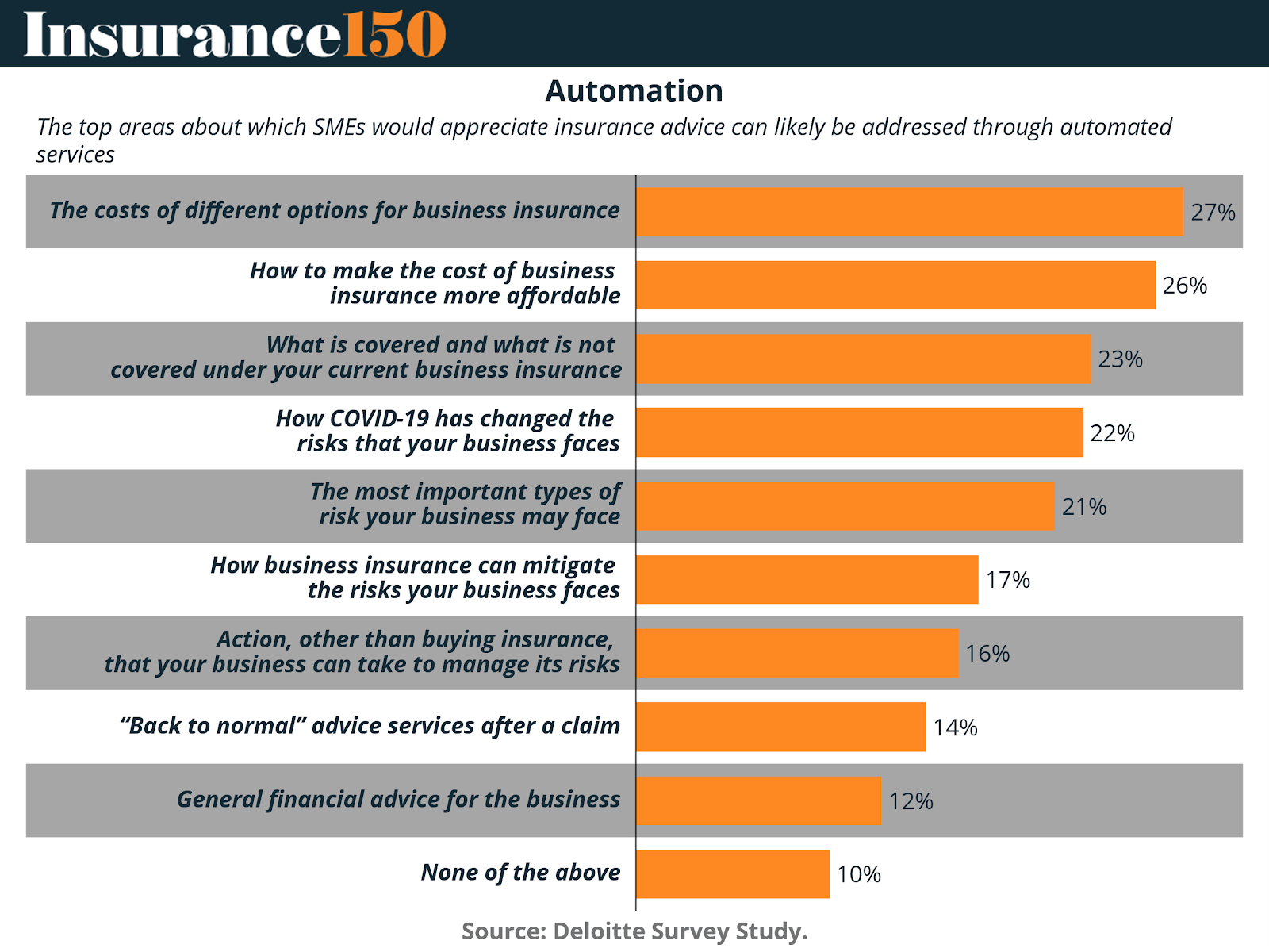 The rising complexity of risks faced by SMEs, combined with limited internal risk management capacity, is driving strong demand for automated advisory and support solutions. Businesses seek tools that simplify coverage selection, monitor exposures, and deliver actionable insights in real time. Surveys indicate that the most valued automated insurance services among SMEs relate to cost comparison (27%), affordability optimization (26%), and clarity around coverage inclusions and exclusions (23%).