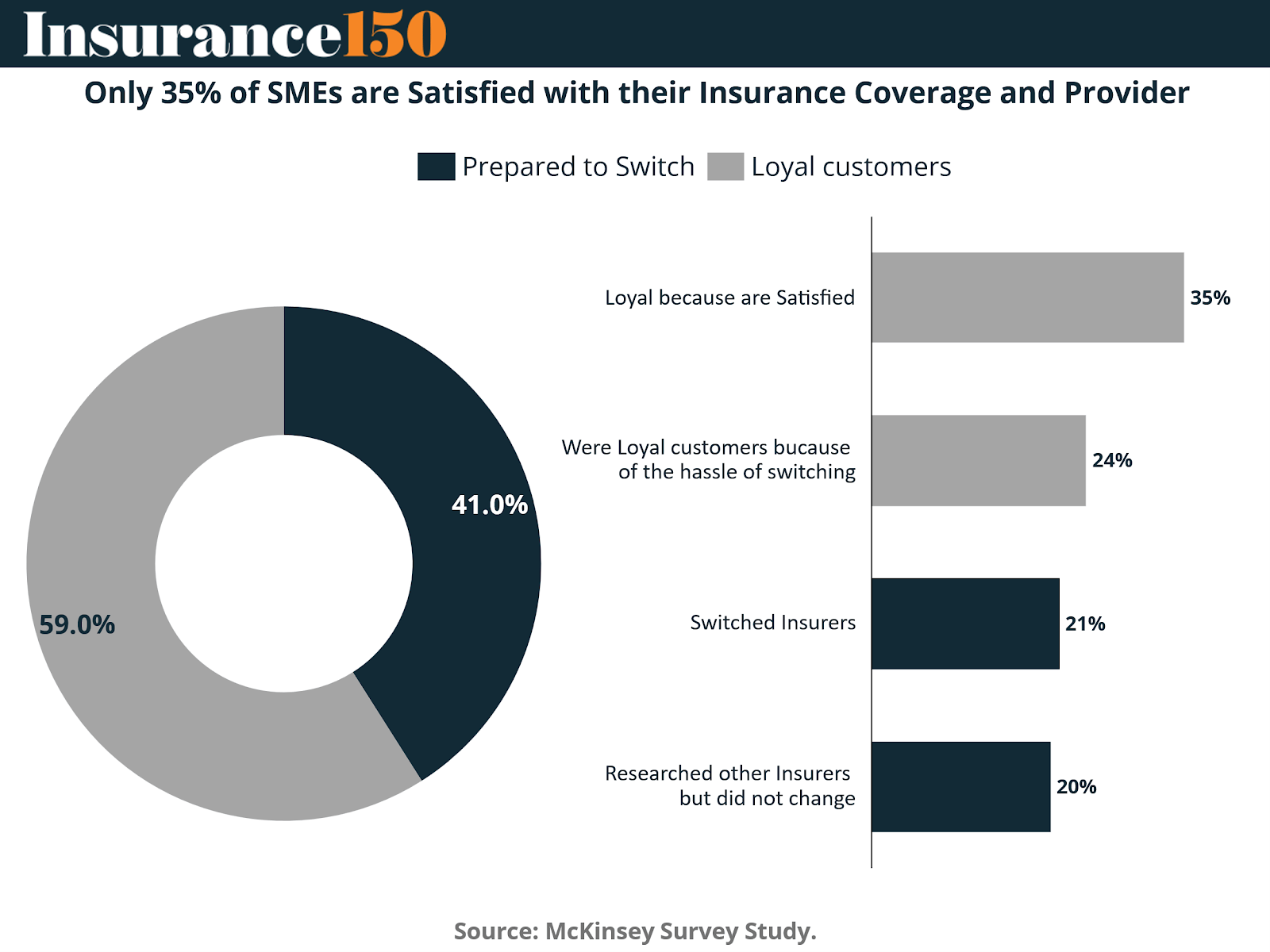 Customer satisfaction remains a central issue within the SME insurance segment. According to recent market research, only 35% of SMEs express genuine satisfaction with their current insurance coverage and provider. A significant 41% are prepared to switch insurers, citing reasons such as lack of product transparency, rigid policy structures, and slow claims processes. Notably, 24% of policyholders maintain loyalty primarily due to the perceived hassle of switching rather than brand affinity or service excellence.