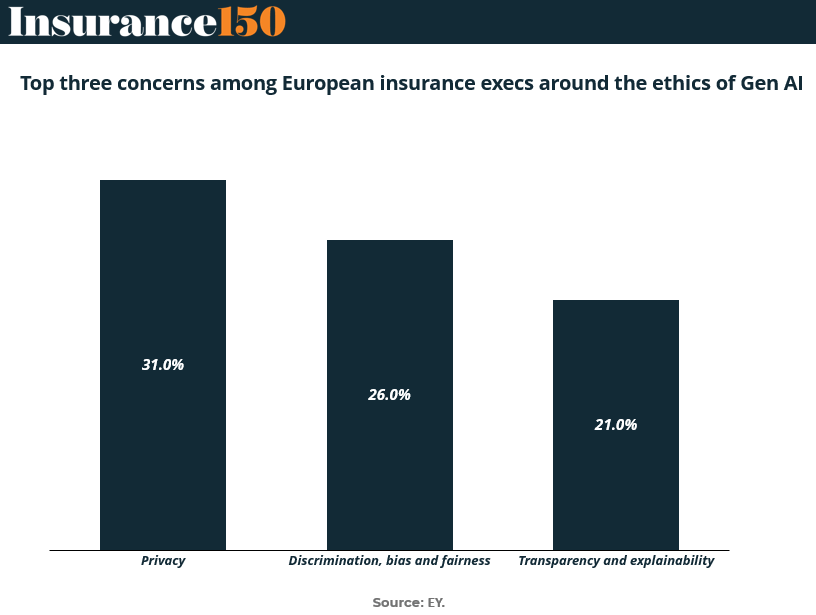 As European insurers ramp up GenAI deployment, the ethical fog around its use is getting harder to ignore. According to EY, 31% of executives cite privacy as their top concern, followed by bias and fairness (26%), and transparency (21%).