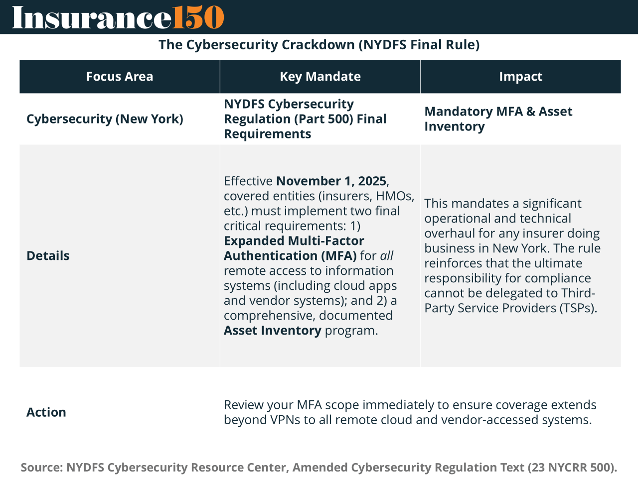 Effective November 1, 2025, the NYDFS Cybersecurity Regulation (Part 500) final rule brings two words to the top of every CISO’s worry list: MFA and Inventory. New York now requires universal Multi-Factor Authentication—no exceptions for agents, vendors, or lazy push notifications. Think phishing-resistant or get ready for fines.