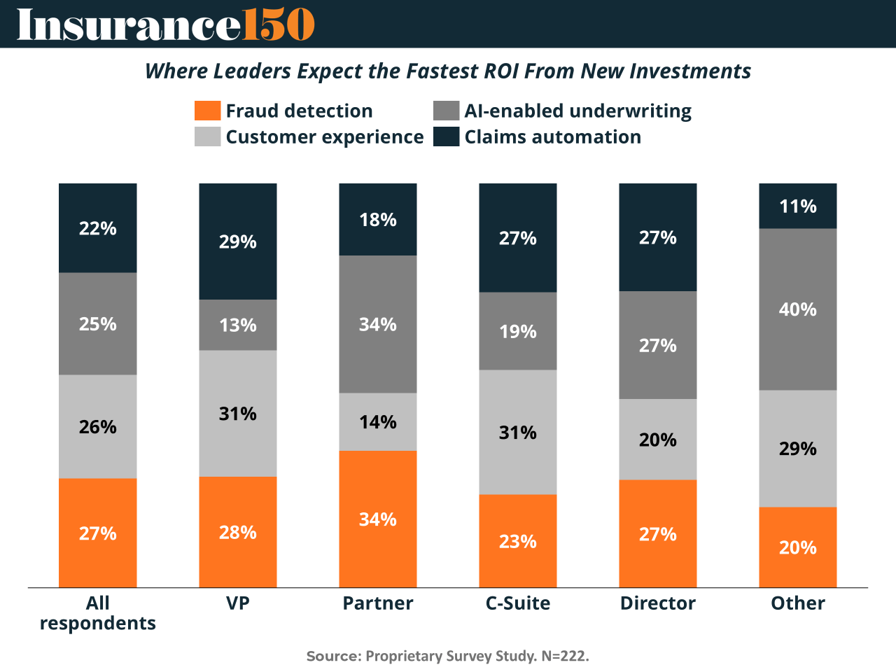 Across all respondents, Fraud Detection (27%) and Customer Experience (26%) top the list for fastest expected ROI, reflecting a focus on margin protection and retention. But priorities diverge by seniority. Partners show the strongest confidence in Fraud Detection and AI-enabled underwriting (both 34%), signaling belief in long-term risk and pricing upside. Meanwhile, the C-suite prioritizes Customer Experience (31%) and Claims Automation (27%), where improvements are highly visible to boards, regulators, and customers.