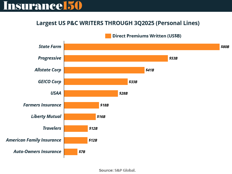 The real signal sits just below. Progressive at ~$53B continues to outpace peers through disciplined rate action, telematics driven underwriting, and faster loss cost repricing. Allstate (~$41B) and GEICO (~$33B) remain formidable, but the distance to the leaders underscores how hard it is to recover share once momentum is lost in personal auto.