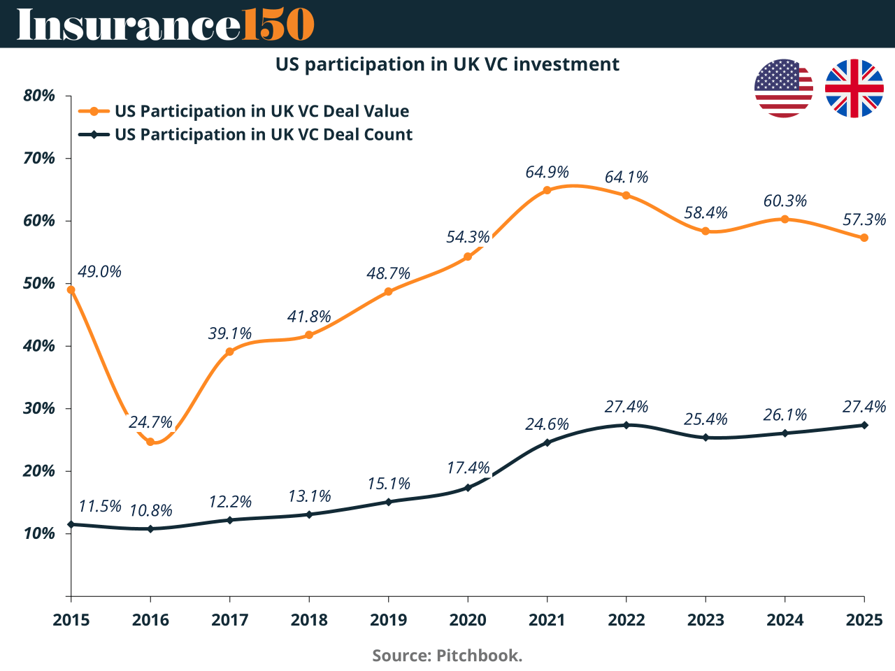 This surge of corporate commitments reflects a longer-term pattern: growing US participation in UK venture capital and private equity deals. According to PitchBook data, US investors were present in 27.4% of all UK VC rounds in 2025, consistent with recent years and a testament to the embedded role of American capital in British innovation.